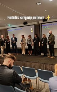 7. studenoga 2025. godine održana je Peta godišnja konferencija portala srednja.hr, na kojoj je po prvi puta dodijeljena nagrada Zlatna kreda. Riječ je o priznanju koje portal dodjeljuje najboljim nastavnicima, profesorima, studentima i učenicima. Natječaj za prijavu kandidata bio je objavljen u lipnju i otvoren svima. Zaprimljeno je ukupno 169 prijava, a u finale je ušlo 30 finalista, među njima i naša profesorica Ana Širanović. Čestitamo profesorici i svim ostalim finalistima, a posebne čestitke upućujemo dobitnicima Zlatne krede! Više o konferenciji i nagradi možete pročitati ovdje: https://www.srednja.hr/obrazovanje-bez-granica/odrzana-konferencija-portala-srednja-hr-obrazovanje-bez-granica-dodijeljene-i-nagrade-zlatna-kreda/